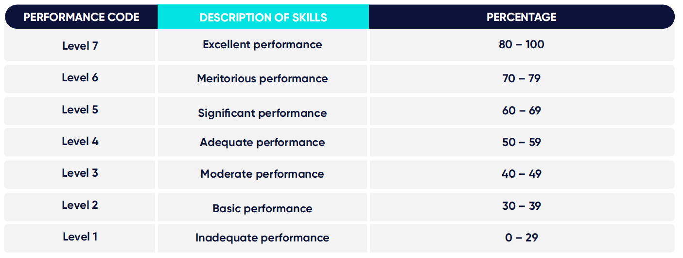 A learner’s performance can be divided into seven levels, as set out below. These levels apply to all grades. If you are hesitant to decide between two levels, rather choose the lower level. This will give you a more accurate representation of your child's performance and motivate the learner to really want to achieve higher levels: