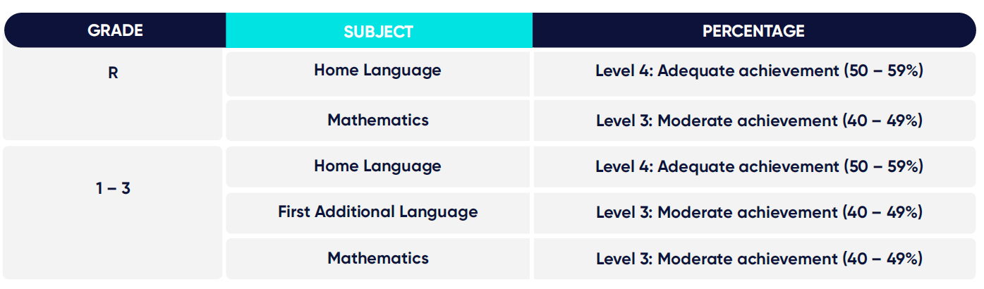 Please see below the pass requirements for Foundation Phase learners. Note: Life Skills is also part of the subjects for Grade R to 3 learners; however, there are no pass requirements for this subject.